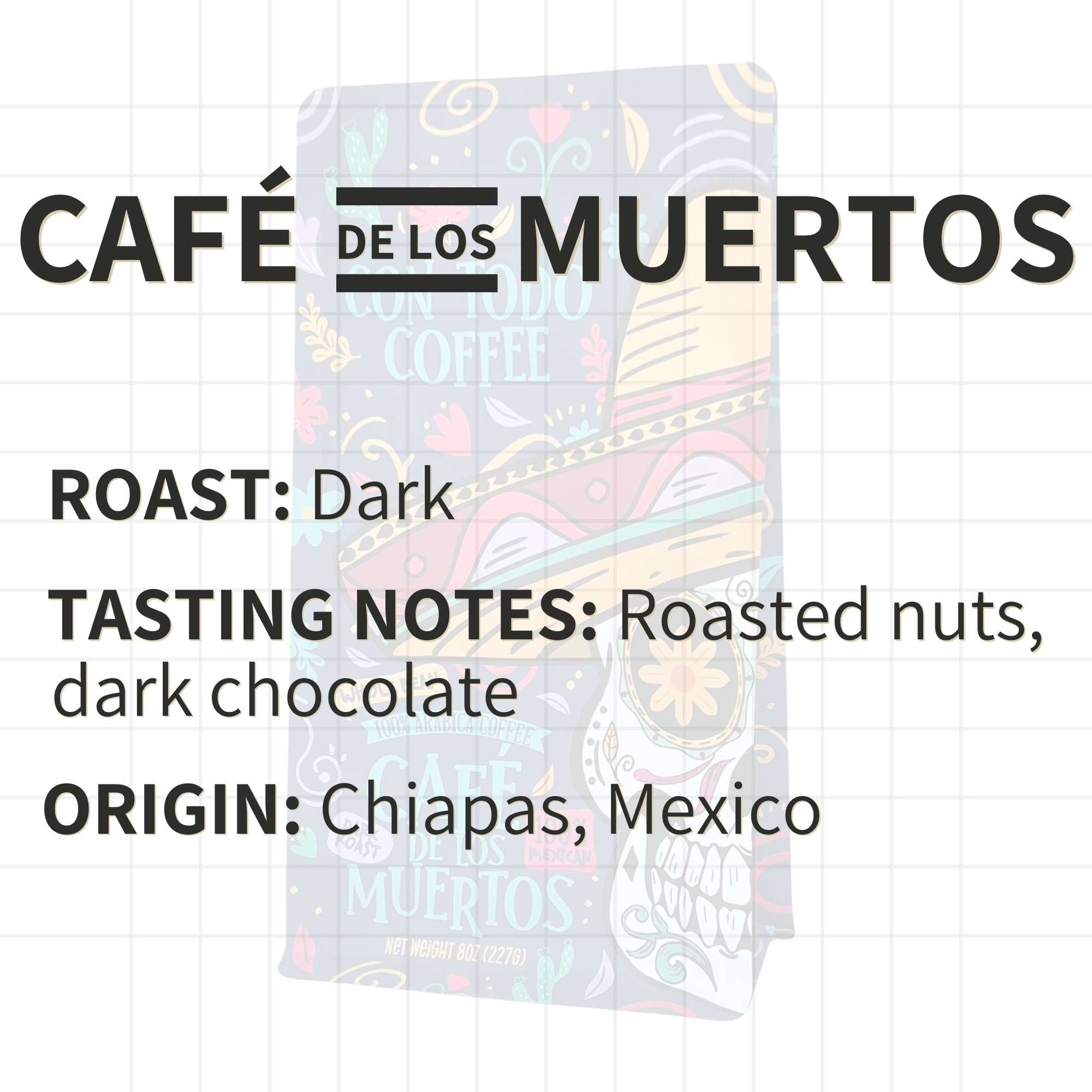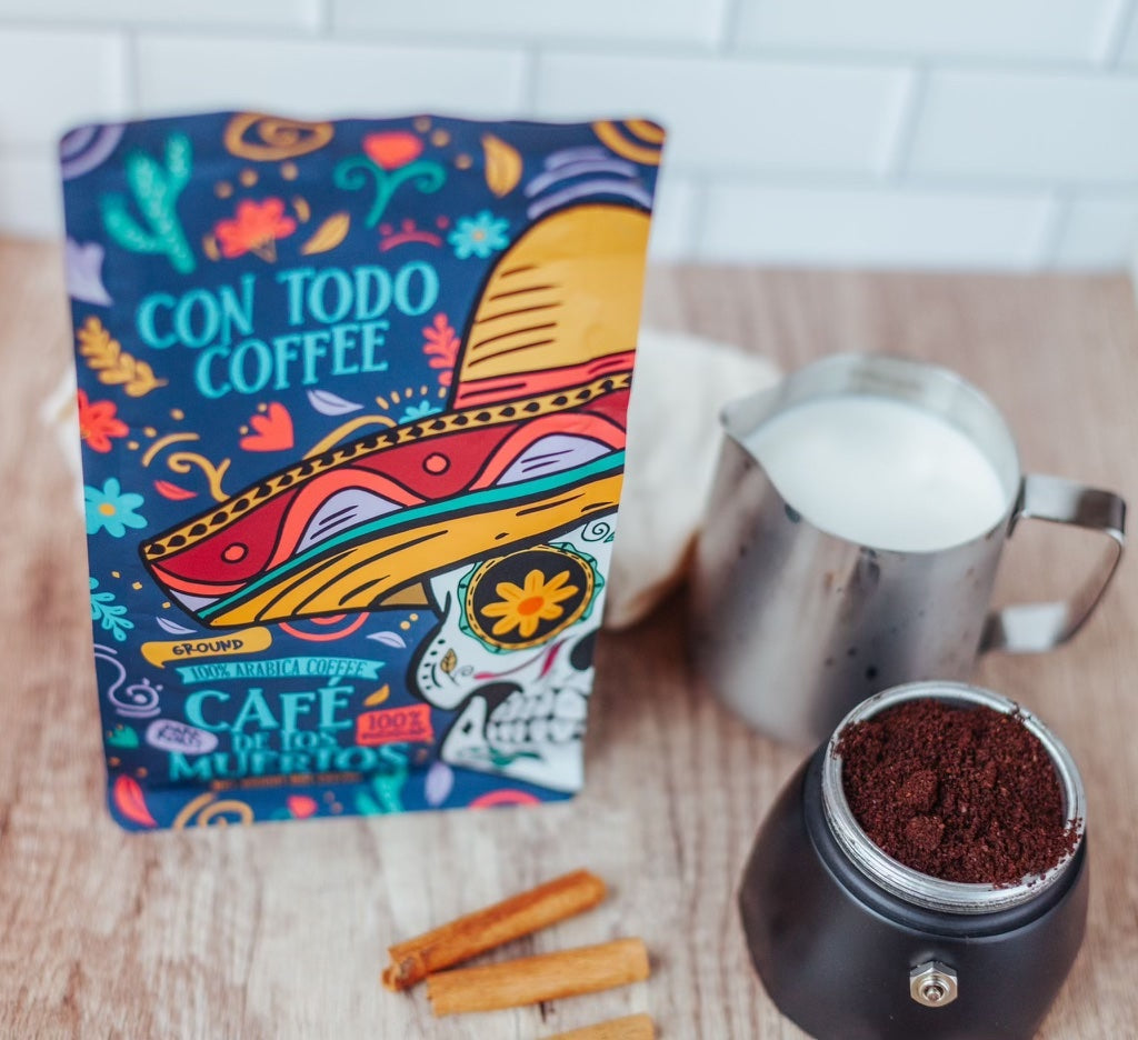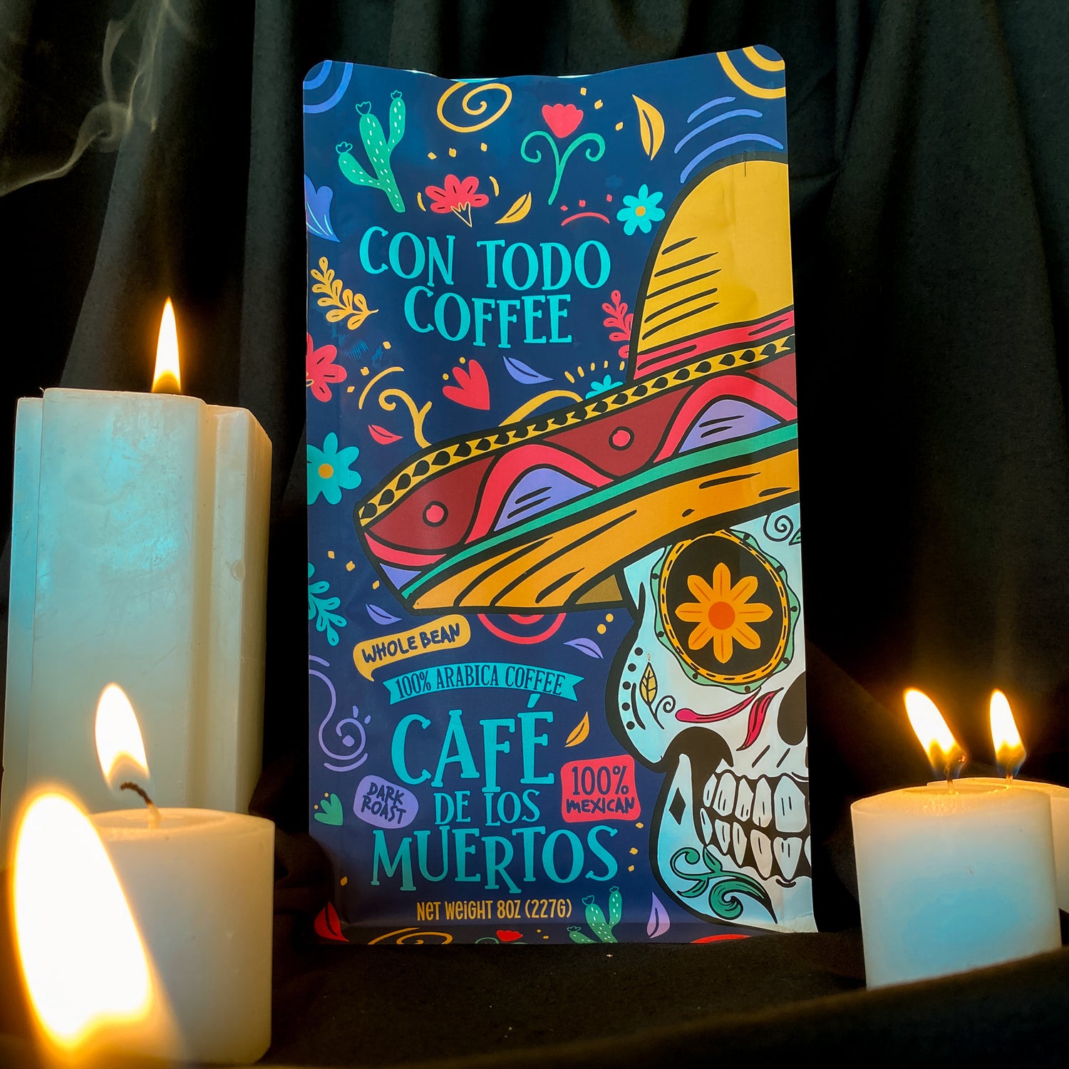 The design of our Café de los Muertos' coffee bag beautifully incorporates elements from the vibrant festivities of the Day of the Dead celebrations we experienced living in Mexico. The Catrina is bright and colorful and serves as a joyful representation of our loved ones that we honor and celebrate during this special time.